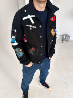 Чорна чоловіча джинсова куртка з яскравими елементамиДжинсова куртка з відкладним коміром - стильна класика, яка ніколи не виходить з моди