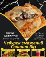 Чебурек смажений Свинина BigСоковита начинка з свинини, цибулі, спецій, солі, тонка скоринка з дріжджового тіста і привабливий аромат та смак. Смакуйте з нами реально.
