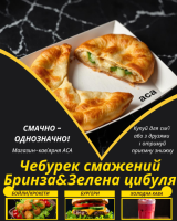 Чебурек смажений Бринза&Зелена цибуляСоковита начинка з бринзи, зеленої цибулі і сметани, тонка скоринка з дріжджового тіста і привабливий аромат та смак. Смакуйте з нами реально.