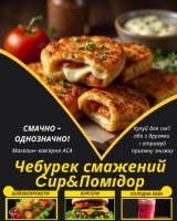 Чебурек смажений Cир&ПомідорСоковита начинка з твердого сиру, помідорів і майонезу, тонка скоринка з дріжджового тіста і привабливий аромат та смак. Смакуйте з нами реально.