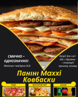 Паніні Maxxi КовбаскиСоковита начинка з ковбасками, сиром, морквою по-корейськи, капустою, майонезним соусом та негострою аджикою, в свіжій булочці Паніні – це смачно!