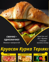 Круасан Курка ТеріякіСоковита начинка з курятиною, соусом Теріякі, слайсами свіжого огірка та маринованого імбиру, посипана смаженим кунжутом на хрумкому листку салату.