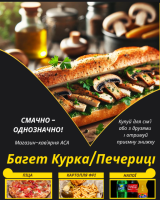 Багет Курка&ПечериціСоковита начинка з курячого філе, грибів Печериць, помідорів, цибулі, зелені, сметани, сиру, в хрусткому свіжому багеті.