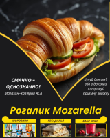 Рогалик MozarellaСвіжий рогалик з пластами сиру Mozarella на овочевій подушці та зеленому листі салату, в поєднанні з Сирним соусом.