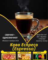 Кава Еспрессо (Espresso)Смачнюща гаряча кава збадьорить вас на весь день. Готується із найсмачніших сортів зернової кави вищого гатунку.