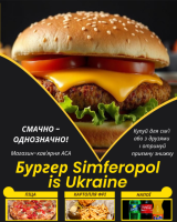 Бургер Simferopol&UkraineСоковита начинка з рибної котлети, огірком, помідором, соусом Тартар, Сирним соусом, зеленню кропу і петрушки, салату Айсберг.
