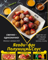 Ягоди-фрі Полуниця&СоусСоковиті ягоди Полуниці, засмажені у фритюрі до золотистого кольору з усіх боків, разом із смачнючим соусом на вибір.