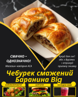 Чебурек смажений Баранина BigСоковита начинка з баранини, цибулі, спецій, солі, тонка скоринка з дріжджового тіста і привабливий аромат та смак. Смакувати з нами реально.