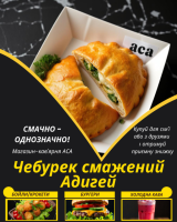 Чебурек смажений АдигейСоковита начинка з Адигейського сиру, зелені петрушки і сметани, тонка скоринка з дріжджового тіста і привабливий аромат та смак. Смакуйте з нами.