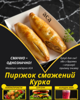 Пиріжок смажений КуркаСоковита начинка з тушкованим курячим фаршем, цибулею і спеціями у пухкому дріжджовому тісті, засмажені разом у фритюрі до золотистого кольору.