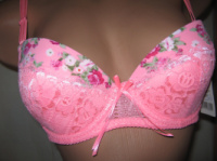 Шикарний бюстгальтер JASSIRE рожевий у квітах із мереживом 80В на поролоніГарний бюстгальтер JASSIRE на поролоні, рожевого кольору у квітах, по чашці і навколо нашит гарний гіпюр, на кісточках, без пуш-апу.